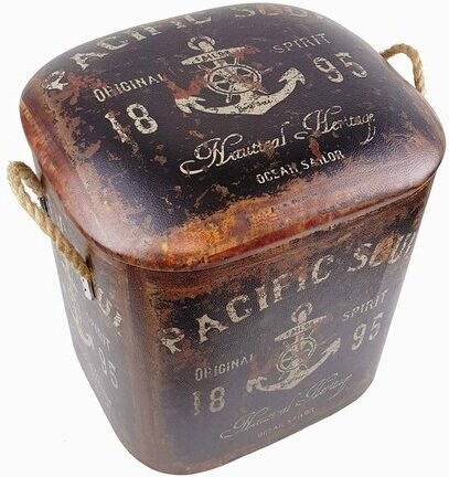 Pilihan tempat duduk dibuat dengan gaya laut, memiliki desain asli dan fungsionalitas yang luas. Pemandangan tong tua yang terkadang berkarat akan menarik bagi pecinta tema bahari atau orang-orang yang menyukai hal-hal yang tidak biasa. Pegangannya terbuat dari tali rami, peti itu sendiri terbuat dari kayu. Tutupnya benar-benar dapat dilepas. Trim kulit imitasi. Berat: 2kg. Tinggi Dada : 30 cm Warna : Coklat. Biaya rata-rata: 6607 rubel.