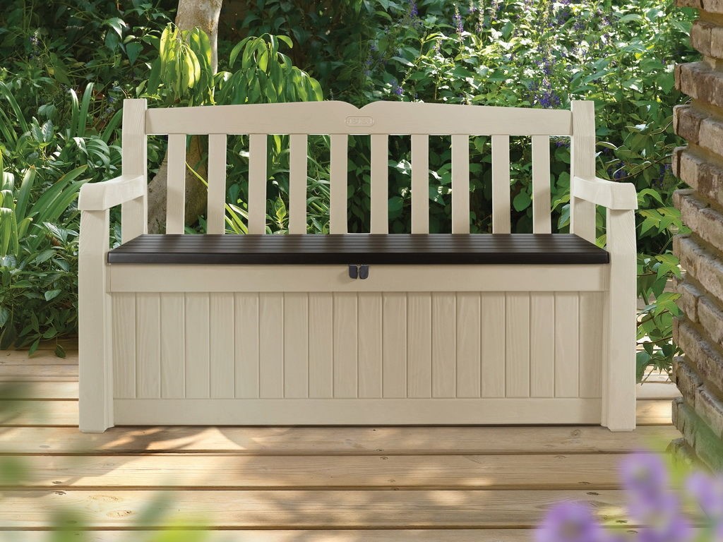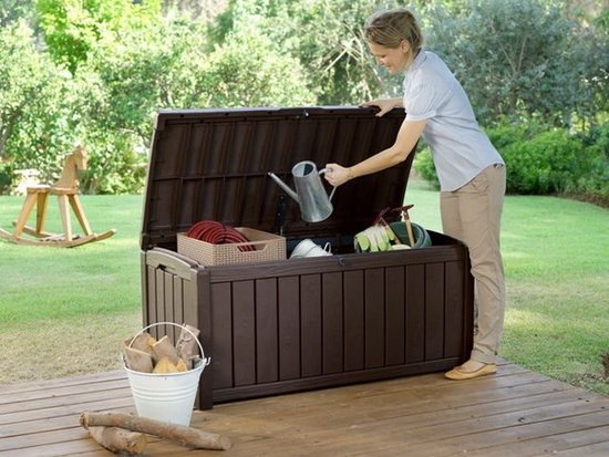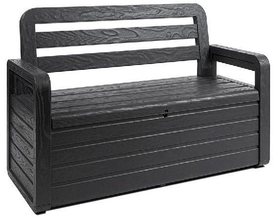 Versi plastik sangat cocok untuk taman atau pondok musim panas. Dapat menyimpan peralatan, barbekyu, tusuk sate, kayu bakar, dll. Tidak seperti kayu, plastik tahan terhadap suhu ekstrem, tidak takut hujan dan kondisi iklim lainnya. Tidak berubah bentuk dan tidak berkarat, tahan beban daya tinggi. Dibuat dalam bentuk bangku taman, tempat Anda dapat menghabiskan malam musim panas. Desainnya dapat dilipat, dapat dipindahkan ke mana saja dan dengan cepat dirakit. Biaya rata-rata: 21490 rubel.