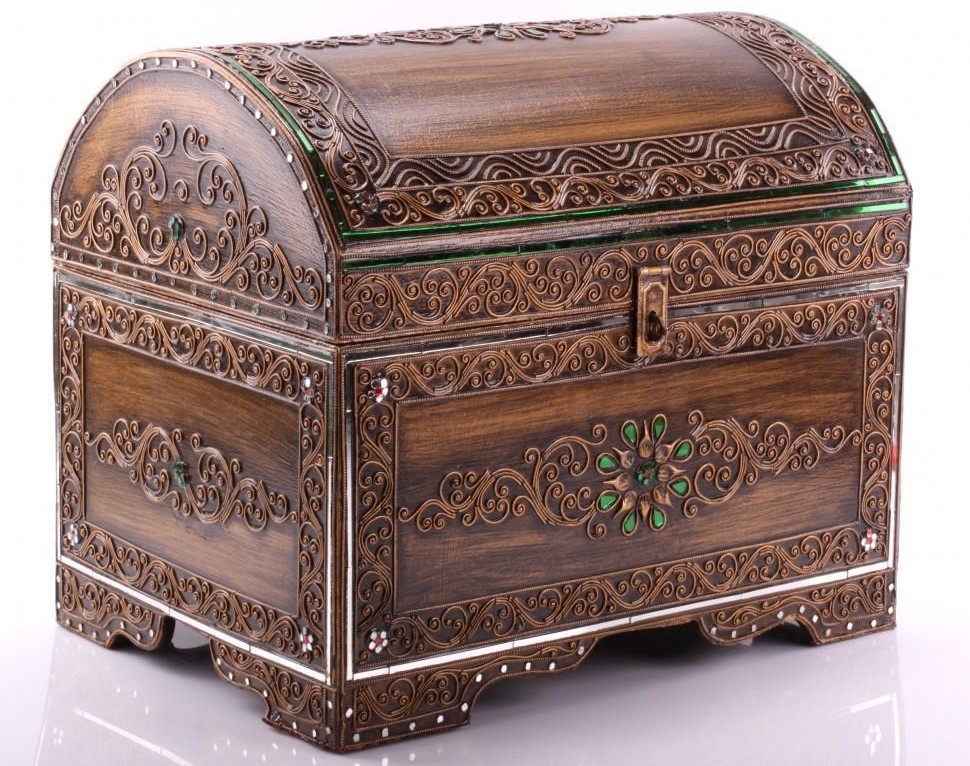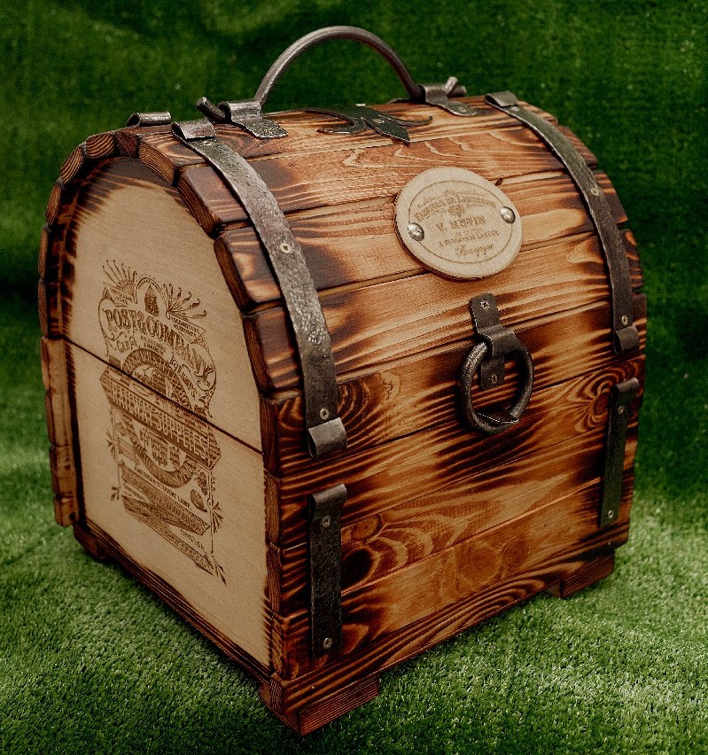Modelnya terbuat dari kayu solid yang dilapisi kulit asli. Dimungkinkan untuk mengunci konten dengan kunci. Fitting terbuat dari kuningan dan akan bertahan selama bertahun-tahun. Dibuat dalam bentuk peti tua, ide hadiah yang bagus untuk penikmat seni dan sejarah. Dimensi: 66x39x55 cm Biaya rata-rata: 65.000 rubel.