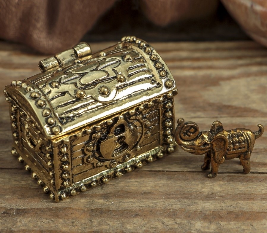 Satu set perunggu peti dekoratif dan gajah yang membawa kemakmuran dan keberuntungan. Dapat digunakan sebagai kotak koin, atau penyimpanan perhiasan kecil. Dimensi kotak: 3,4x2,6 cm Harga rata-rata: 425 rubel.