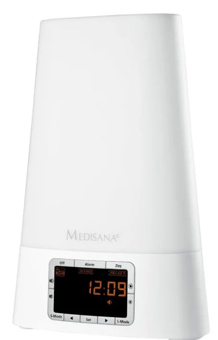 Medisana adalah perusahaan yang bergerak di bidang produk kesehatan. Model WL450 memiliki mode tidur cepat. Mudah diatur - cukup tekan satu tombol. Jika Anda ingin membaca buku di malam hari, Anda dapat mengatur kecerahan ke minimum dan menggunakan jam sebagai lampu. Untuk jam alarm, total 8 melodi ditawarkan - derak api, suara ombak, hujan, dan nyanyian burung. Suara muncul satu menit sebelum diangkat.