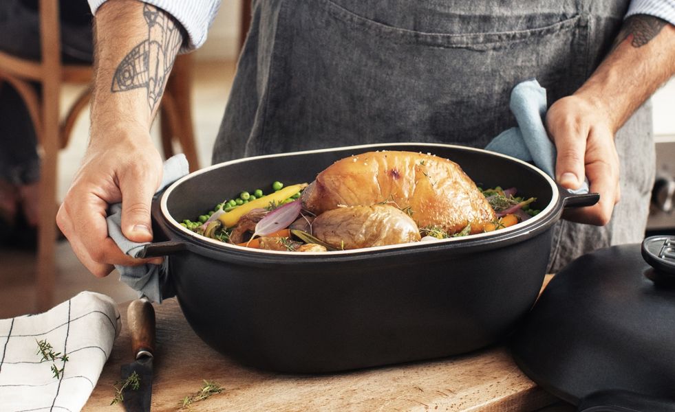 Panci besi cor dengan tutup keramik adalah kombinasi sempurna untuk memanggang dan merebus yang berair.