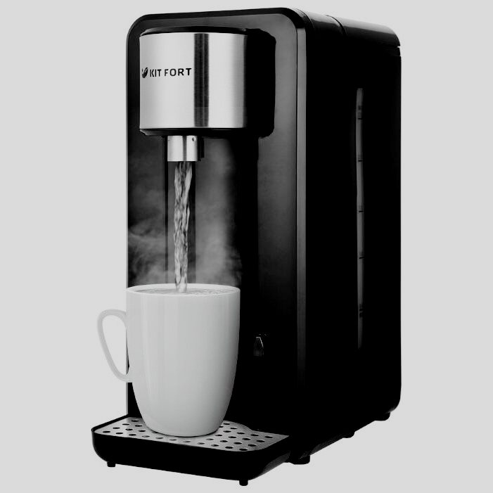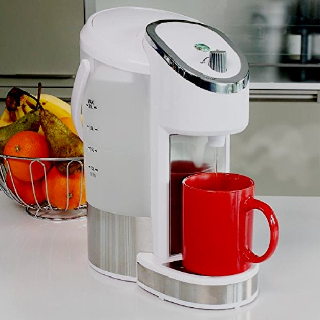 Saat Anda perlu menyeduh teh atau kopi, cukup dengan membawa gelas di bawah lubang yang khusus disesuaikan untuk tujuan ini, dan tekan tombol suplai cairan. Tidak perlu mengangkat atau memiringkan struktur. Air disuplai di bawah tekanan tertentu, yang memungkinkan untuk menyediakan semua orang dengan air mendidih.