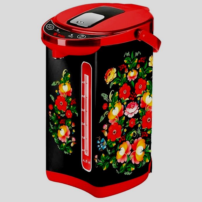 Perangkat dapat diisi dengan 4,5 liter cairan. Mendidih dalam beberapa menit. Tahan suhu yang disetel untuk waktu yang lama. Dayanya signifikan - 1000 watt. Tubuh terbuat dari plastik tahan lama. Ini tidak akan berhasil tanpa air. Meningkatkan keamanan dengan mengunci tutupnya. Case ini dilengkapi dengan motif yang menarik. Ini sangat populer di kalangan pekerja kantoran.