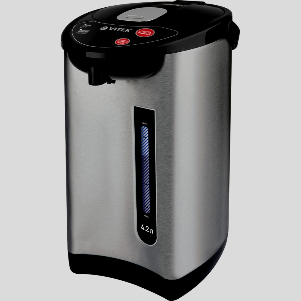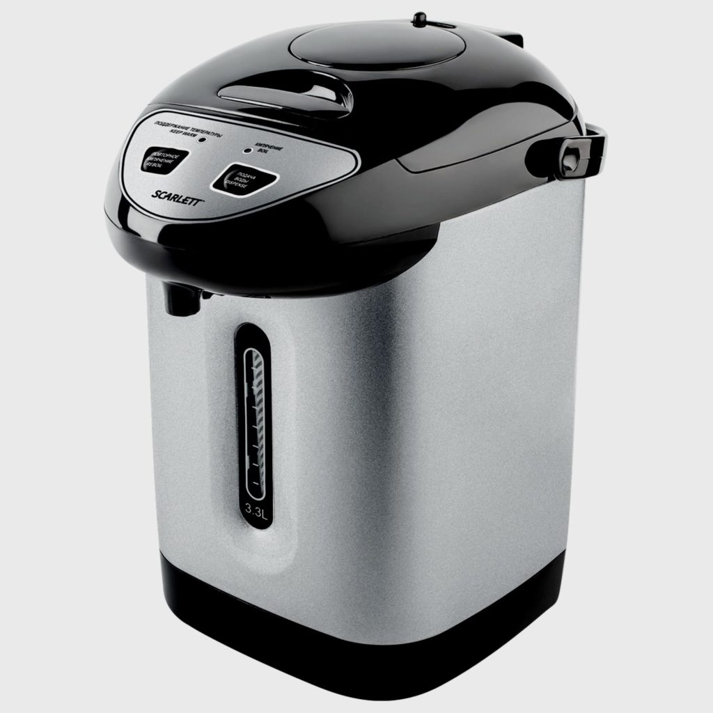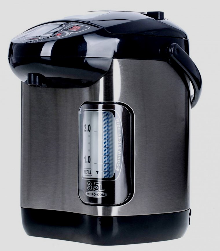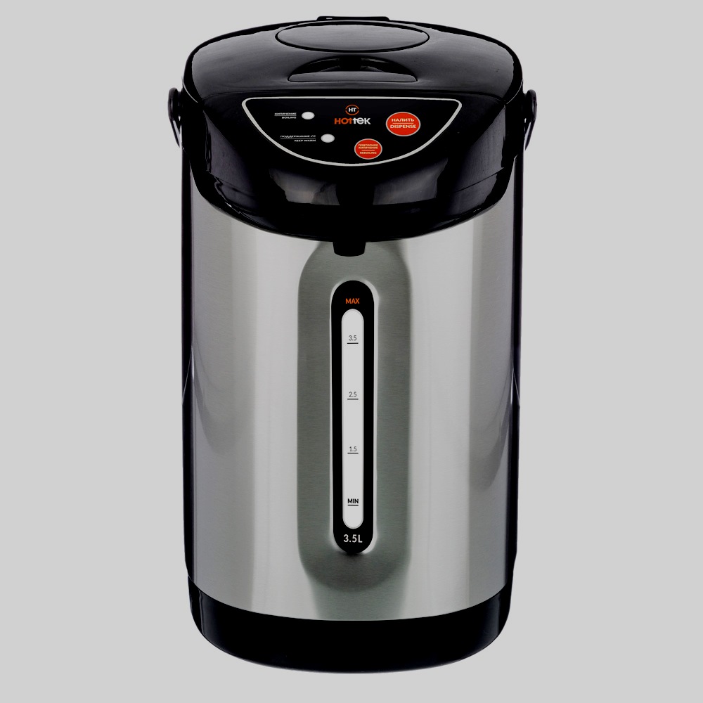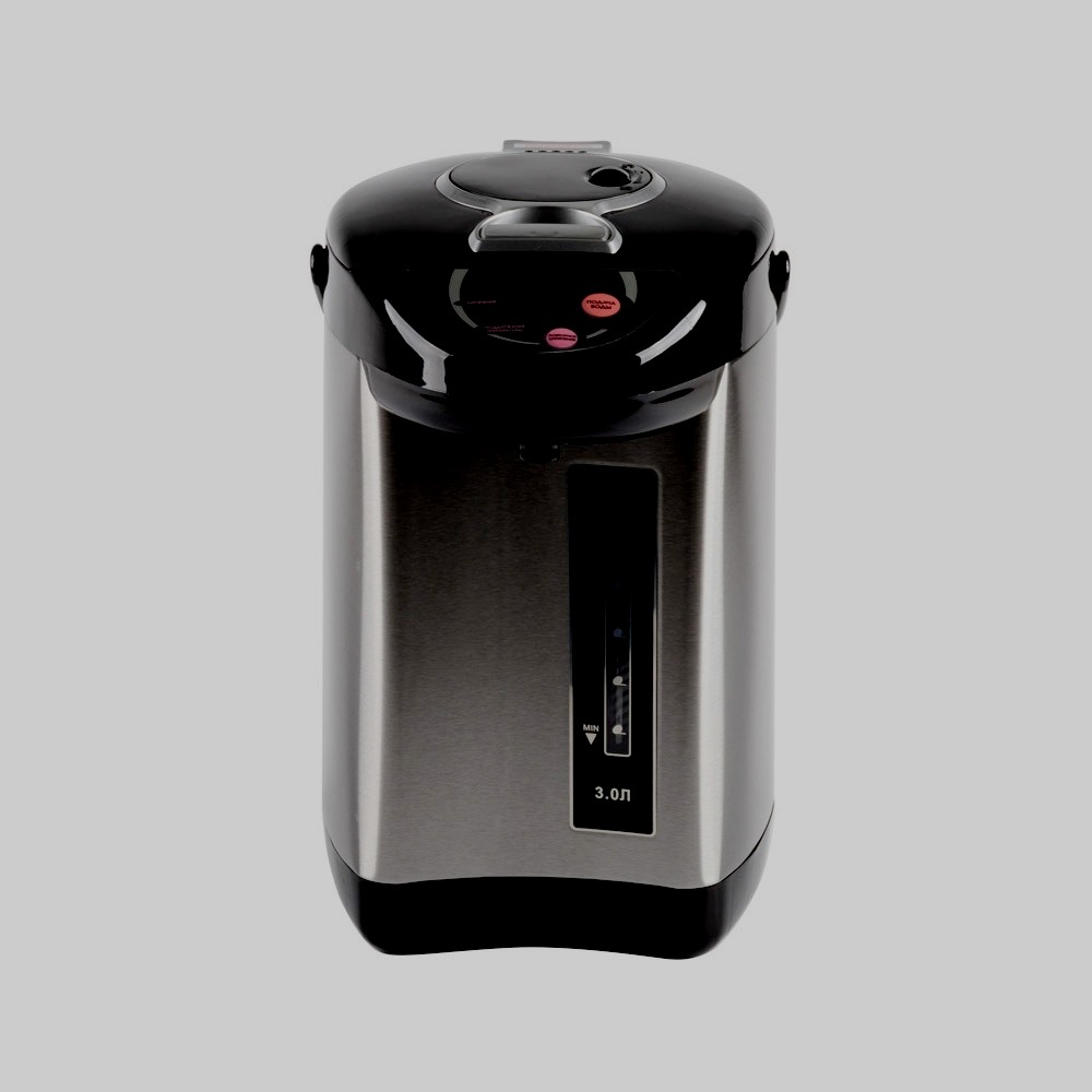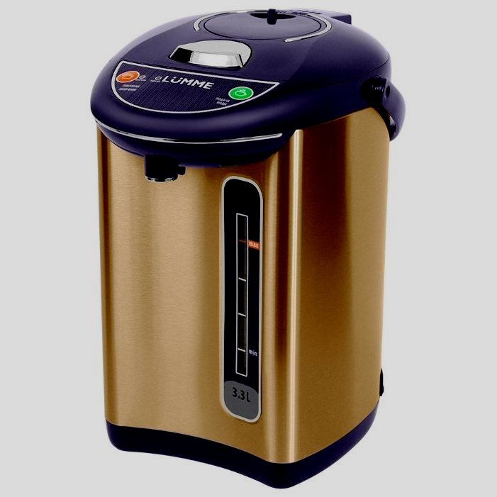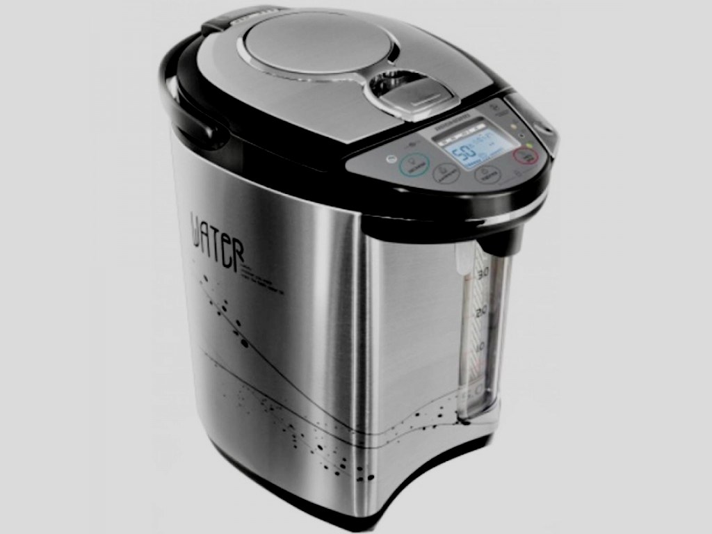 Perangkat ini dirancang untuk merebus, memanaskan otomatis, dan merebus kembali. Pabrikan melengkapi keturunannya dengan LED - indikasi dan perlindungan terhadap panas berlebih. Tubuh adalah baja padat. Air disuplai secara otomatis. Pompa dalam mode manual. Jika jumlah air sedikit, thermopot akan mati secara otomatis. Dirancang untuk 3,3 liter. Daya dalam mode aktif - 750 W, sambil mempertahankan suhu - 30 W. Labu terbuat dari logam. Elemen pemanas adalah koil tertutup. Kasus dengan dinding ganda. Ada indikator ketinggian air dan kunci dry run. Ada juga kunci panel kontrol.
