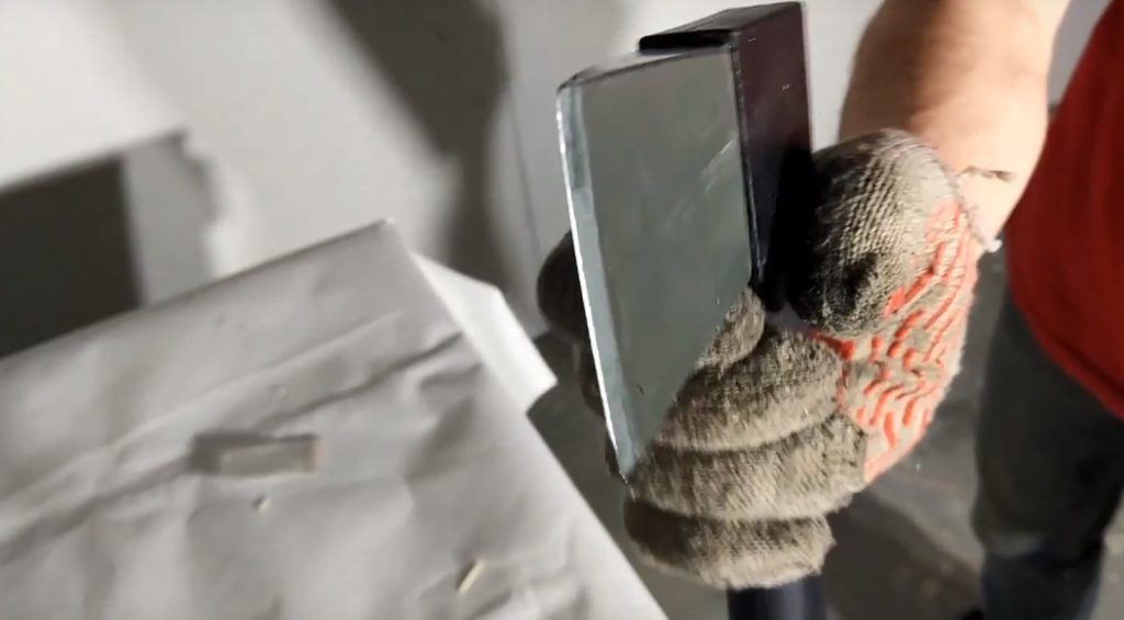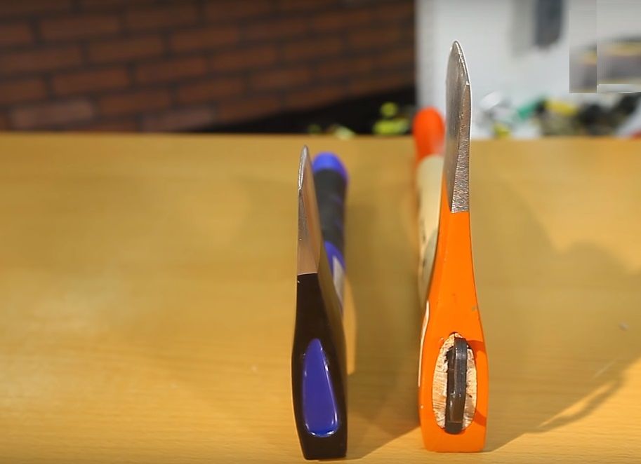 Pegangan yang terbuat dari fiberglass yang diperkuat dengan lapisan anti gesekan yang kasar, bahkan basah, memegang dengan baik di tangan dan tidak tergelincir. Dan untuk keandalan yang lebih besar, ada dudukan telapak tangan di bagian bawah. Di dalamnya berlubang, jadi massa utama alat adalah bagian kerja, yang terbuat dari baja berkualitas tinggi. Ini memiliki pegangan yang aman.