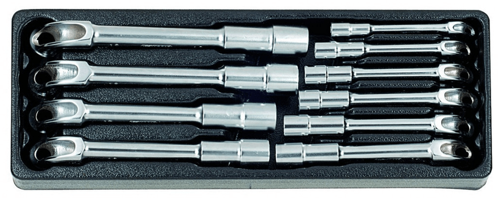 Kabel ekstensi juga dapat diproduksi dalam versi yang fleksibel. Model seperti itu adalah batang yang ditekuk di semua bidang, yang memiliki slot tetrahedral tradisional di ujungnya. Cangkang mereka juga dapat bervariasi - mereka dapat memiliki lapisan polimer atau karet. Di dalam alat seperti itu ada pegas, yang bertanggung jawab untuk mentransmisikan torsi perangkat ke mur yang berputar.