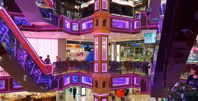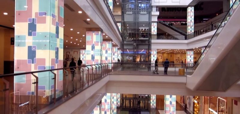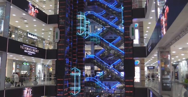 Di atas lahan seluas 283.000 meter persegi, terdapat 6 lantai dengan pertokoan, hiburan, kafe, restoran, serta tempat parkir untuk 2.700 mobil. Di lantai dasar, Anda dapat duduk di kafe dan mengagumi air mancur besar yang indah dengan pancaran air berwarna. Selain itu, jet terbesar 32 meter mencapai atap oval transparan, yang menawarkan pemandangan gedung pencakar langit di ibu kota yang mengesankan.