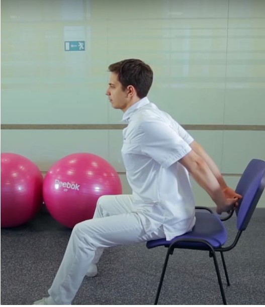 - Duduk di lantai, kaki harus dekat panggul. Lengan kiri, ditekuk di siku, dibawa ke belakang. Kemudian hal yang sama diulangi dengan tangan yang lain. Siku tidak terentang, dekat dengan tubuh.