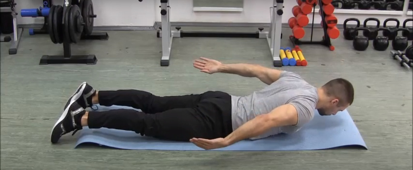 - Berbaring tengkurap sehingga lengan bawah Anda ditekan ke lantai. Luruskan lengan Anda dan letakkan di belakang punggung Anda. Mereka harus sejajar dengan tubuh, angkat batang tubuh.