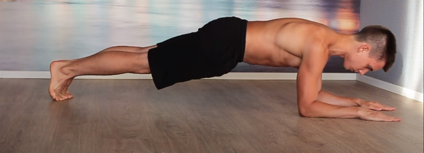 - Siku di bawah bahu, lengan direntangkan ke depan sejajar satu sama lain. Telapak tangan harus ditekan ke lantai, dan jari-jari harus mengarah ke depan. Lengan bawah dan siku sedekat mungkin dengan tubuh.