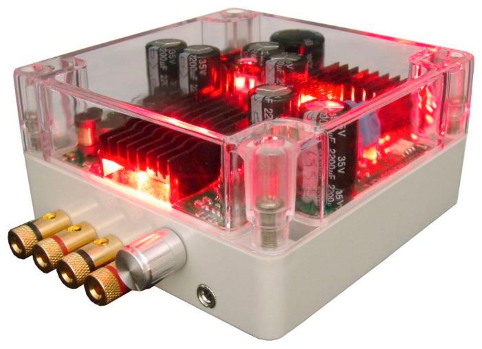 Ini adalah perwakilan dari penguat anggaran. Daya yang dinyatakan oleh pabrikan adalah 110 watt. Memiliki 2 saluran. Berbeda dalam ukuran kecil dan berat kecil. Tetapi memiliki desain yang sangat orisinal. Melalui bagian atas kasing yang transparan, Anda dapat melihat seluruh "isian", yang disorot dengan warna merah. Dibuat dalam warna abu-abu, tombol penyesuaian dibuat dalam warna emas.