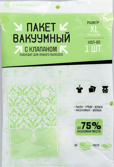 Vakum dalam tas Textura tahan lama dan andal. Keamanan hal-hal dalam ruang hampa dijamin! Pilihan paket besar memungkinkan Anda untuk memasukkan lebih banyak barang ke dalamnya. Ukuran vacuum bag 110x70, ada valve juga! Karena keberadaan katup, keamanan vakum dipastikan untuk waktu yang lama. Tindakan pencegahan ditunjukkan pada kemasan Textura Damascus. Desain tidak boleh diabaikan.Cetakan pada bungkusnya menarik, warna polanya akan menyenangkan mata. Tempat akan meningkat hingga 75%, bahaya serangga, bau dan kelembaban dihilangkan.