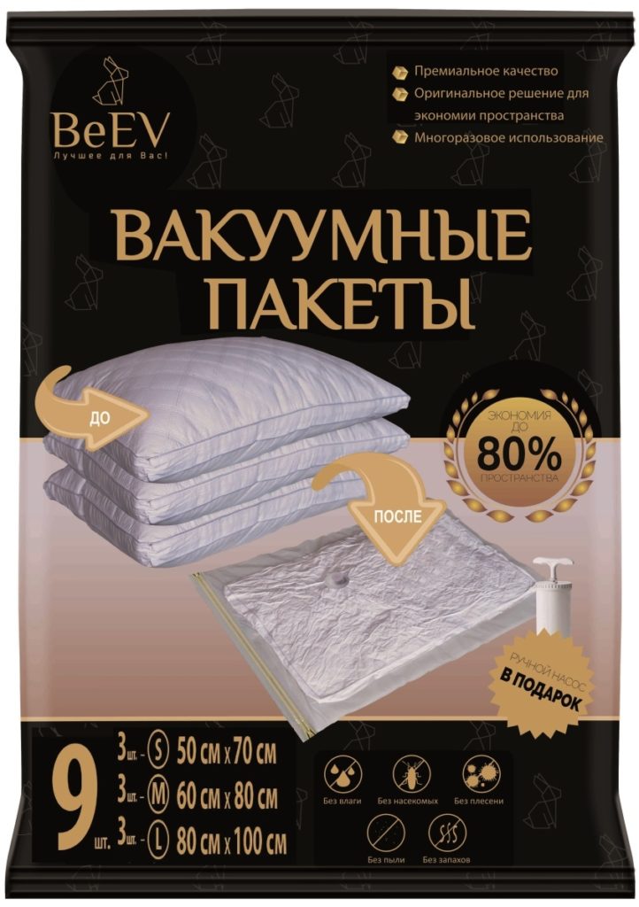 Set termasuk 9 kantong vakum (50x70 - 3 pcs 60x80 - 3 pcs 80x100 - 3 pcs.), serta pompa.Paket merek BeEV sangat bagus untuk dipindahkan dan penyimpanan jangka panjang, karena paketnya cukup besar untuk memuat barang-barang besar dan membantu menghemat ruang kosong hingga 80%!
