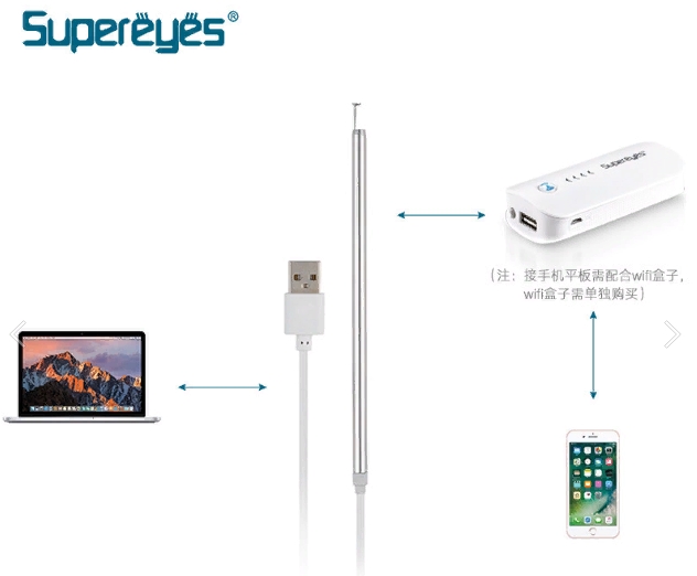 Model USB ini terutama dirancang untuk diagnosis dan digunakan untuk mempelajari saluran telinga. Hal ini juga dapat digunakan untuk mengekstrak lilin dari saluran telinga. Tubuh perangkat terbuat dari stainless steel berkualitas tinggi.