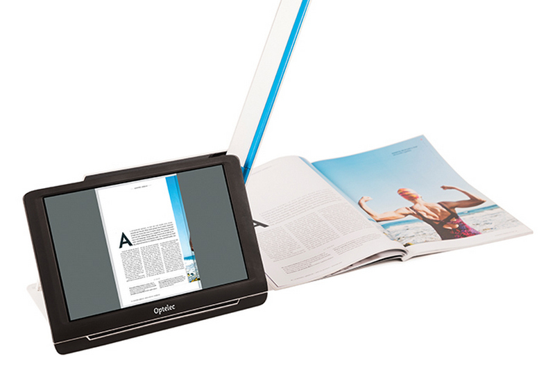 Sampel ini adalah yang terbaik dalam penjualan di antara peralatan serupa. Gambar diperbesar dengan sangat halus dari 0,5 hingga 20 kali, yang memungkinkan Anda mempelajari dokumentasi yang diperlukan dengan nyaman, membaca cetakan kecil. Manajemen dilakukan melalui panel sentuh, antarmuka kontrolnya intuitif. Ada beberapa kamera dalam desain: ukuran penuh, panorama dan untuk membaca. Beberapa skema warna sudah terpasang sebelumnya di memori, yang dilakukan untuk kontras saat menampilkan gambar. Gadget ini memiliki asisten suara yang berbicara beberapa bahasa, juga memungkinkan untuk menyesuaikan suara - pria atau wanita. Kasing ini memiliki jack untuk menghubungkan headphone atau speaker audio eksternal. Pada saat yang sama, menggunakan kabel USB, dimungkinkan untuk menghubungkan pembesar video ke komputer atau TV. Pada prinsipnya, dimungkinkan untuk terhubung ke semua perangkat di atas menggunakan teknologi Bluetooth, serta mentransfer informasi grafik yang disimpan ke mereka. Sumber daya berupa baterai cukup untuk 3,5 jam operasi tanpa gangguan.Desain kamera yang cermat memungkinkan Anda mengambil gambar dari format yang paling tidak biasa. Ada indikator suara. Biaya yang disarankan untuk rantai ritel adalah 142.000 rubel.