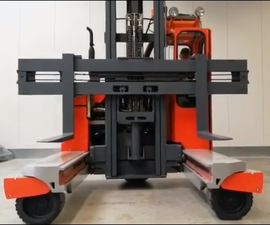 Model ini menggabungkan truk jangkauan, forklift, dan pemuat samping. Keserbagunaan seperti itu dicapai berkat desain khusus: tiang tipe bingkai memanjang secara horizontal. Juga fitur khas adalah drive terpisah dari setiap roda.