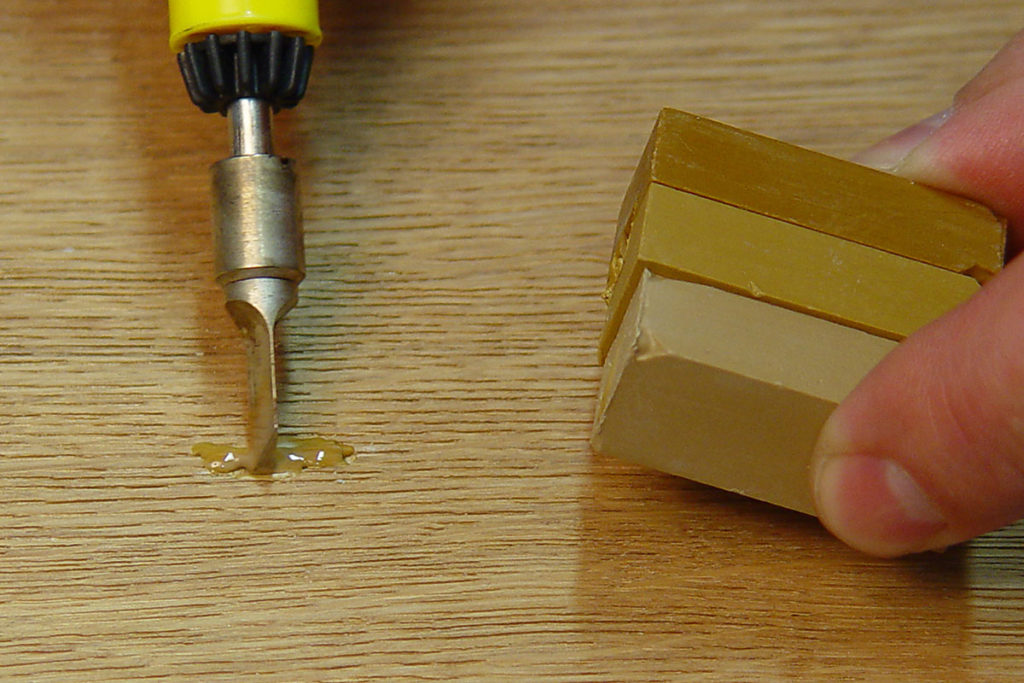 Sebelum menerapkan, lelehkan sedikit lilin dengan besi solder dan isi dengan chip atau retakan. Setelah pendinginan dan pengerasan lilin, buang kelebihannya.