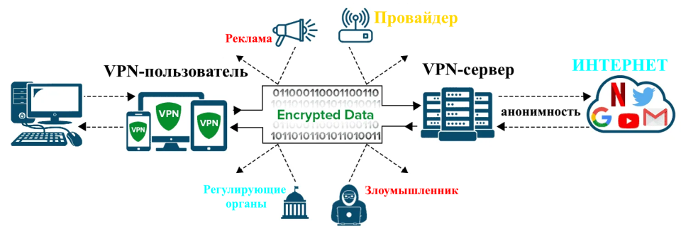 Ketika fungsi VPN diluncurkan, lalu lintas dienkripsi dan dikirim ke server yang terletak di mana saja di dunia. Akibatnya, lokasi dan alamat IP asli tidak terlihat oleh ISP, tetapi alamat jaringan virtual yang ditampilkan. Kemudian lalu lintas diarahkan ke aplikasi atau situs yang diinginkan, yang "melihat" server tersebut sebagai sumber. Ini menciptakan kemungkinan: