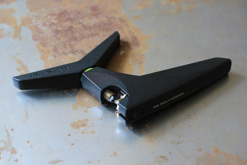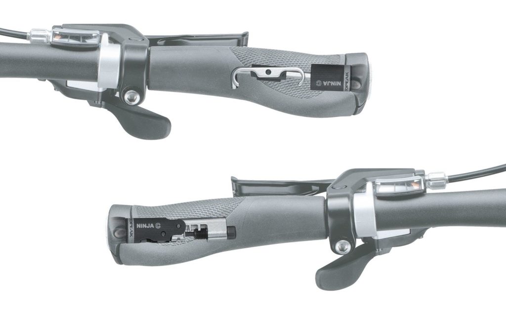 Alat yang tidak biasa. Pegangan pemerasan secara bersamaan bertindak sebagai busi kemudi (cocok untuk roda kemudi dengan diameter minimum 16,5 mm, maksimum 20 mm). Cocok untuk mengganti dan memperbaiki bahan habis pakai pada sepeda berkecepatan tinggi (Campagnolo - 11) Ditambah kompartemen untuk pin, pengait, dan kunci hex 4 mm.
