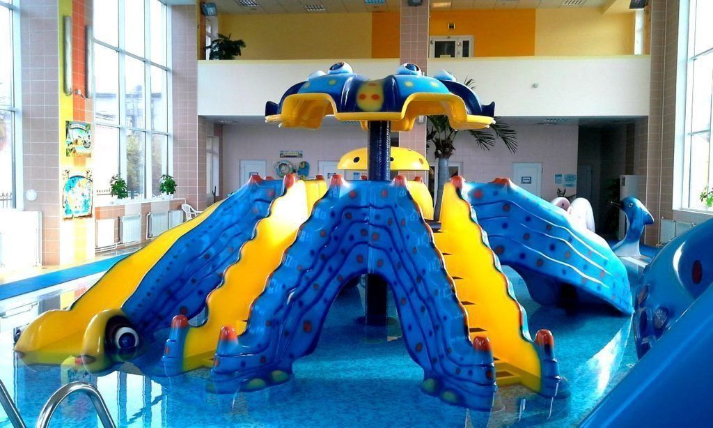Pusat hiburan anak-anak termasuk taman air, kolam renang yang luas, dan gelanggang es. Kolam renang anak berbeda dalam ukuran 12 * 9 * 0,9 meter. Rata-rata, suhu air di setiap kolam dan udara di dalam ruangan dijaga antara 28-32 derajat. Secara umum, pusat ini menampung 400 orang. Di wilayah tersebut terdapat sebuah kafe, kolam renang dengan geyser built-in dan fasilitas hydromassage.Untuk anak-anak, labirin dua tingkat dan seluncuran dengan kotak pasir dibangun. Untuk hiburan yang menyenangkan, Anda dapat menyewa kursi rotan. Ruang ganti, lemari pakaian, dan kamar mandi dilengkapi dengan semua yang diperlukan untuk kenyamanan. Jika mau, Anda bisa bermain biliar, bola voli, atau bulu tangkis.