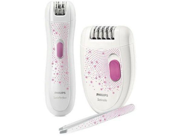 Set terdiri dari epilator, epilator mini dan pinset, sikat pembersih dan kasing. Epilator mini dioperasikan dengan baterai. Ini lebih sempit, jadi itu melakukan penataan yang bagus di area bikini. Pinset digunakan untuk menghilangkan rambut wajah atau untuk memperbaiki alis.