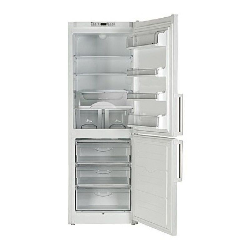 Artikel model putih 6321 untuk 2 ruang dengan freezer di bagian bawah. Jumlah elemen: 3 laci freezer, 4 rak kaca yang dapat disesuaikan, dua laci dalam dan 4 saku pintu, nampan untuk selusin telur. Pintu dengan dua pegangan yang terpasang terbuka ke kanan dan ke kiri, tergantung pada kanopinya.