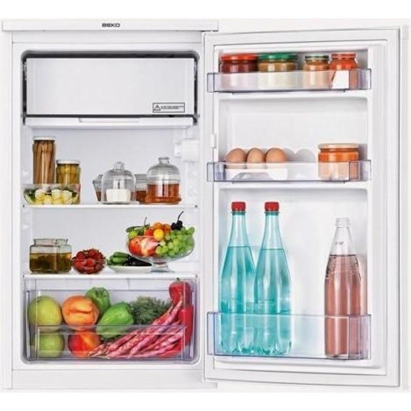 Kulkas kecil artikel 190320 untuk dua kamar dengan satu pintu dan pegangan tersembunyi untuk membukanya. Freezer ada di atas. Terdapat 2 rak kaca yang ditata ulang, 2 laci untuk produk sayur dan buah, serta tiga saku pintu. Baki telur kecil hingga 6 butir telur Pintu dipasang di sisi mana pun. Warna putih.