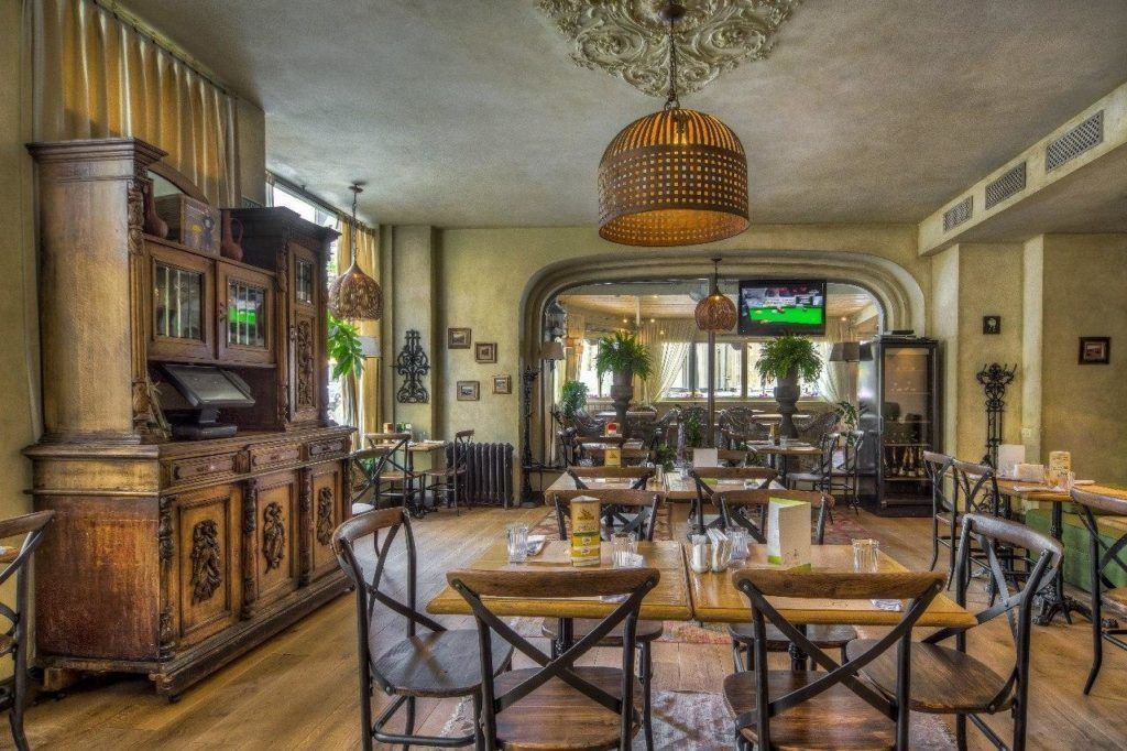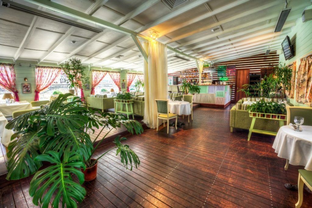 Aula besar yang cerah didekorasi dengan panel tembaga, partisi kayu ek, dan bola linden. Karena restoran ini diposisikan sebagai restoran keluarga, ada kamar anak-anak yang luas dengan mainan, ayunan, dan banyak lagi. Ada teras di atap, di mana trampolin dipasang di musim panas.