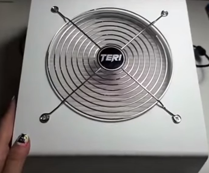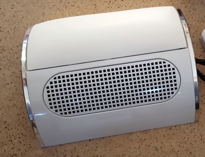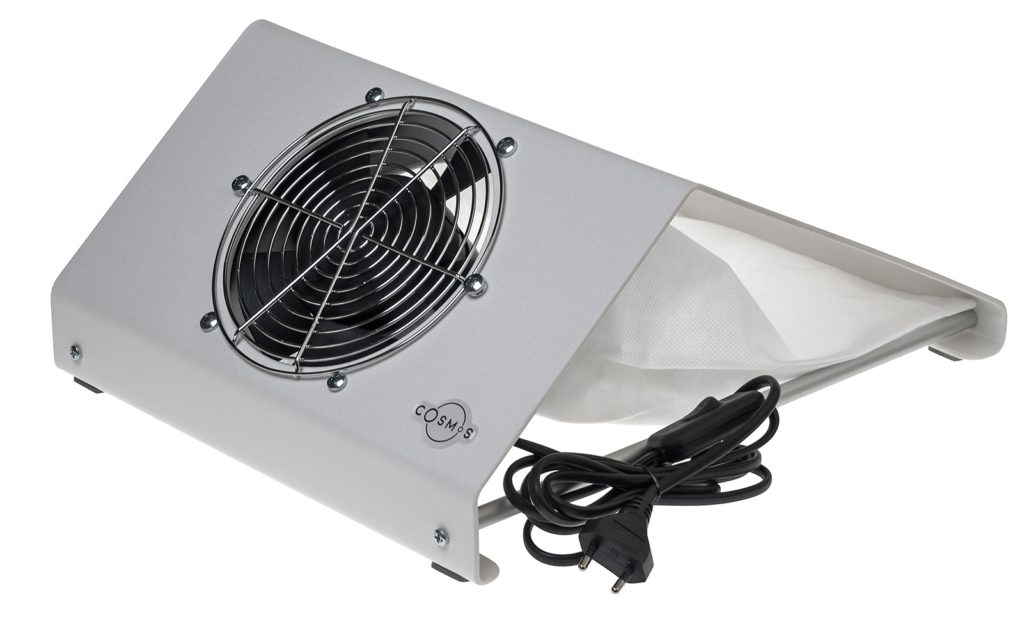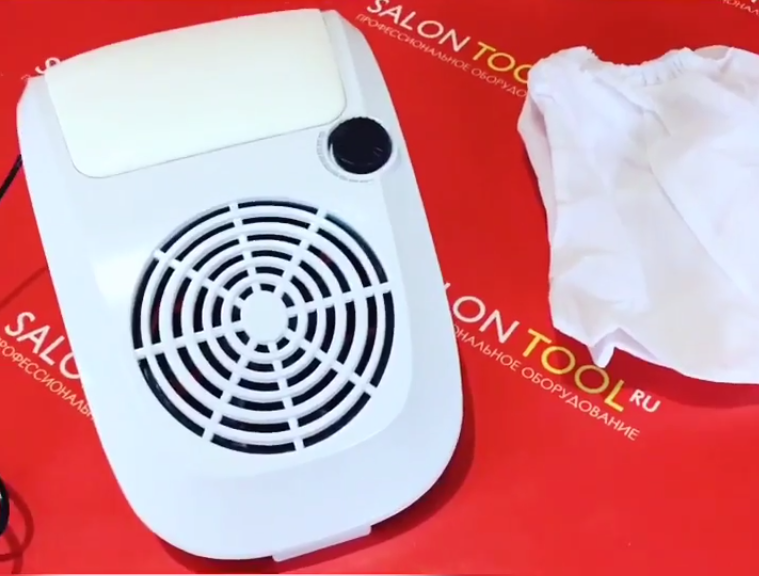 Di pangkalan kecil, ada satu potongan besar bundar di mana ada kipas yang menyerap hampir semua jenis debu kuku. Perangkat berisi perangkat yang mengurangi tingkat kebisingan di bawah beban berat pada mesin. Tudung memiliki bentuk segitiga, yang sangat nyaman digunakan. Dayanya 20 watt. Sebuah tas untuk mengumpulkan debu kuku ditempatkan di bawah "rumah". Serat terjalin sedemikian rupa sehingga dapat menahan debu, tetapi udara bersirkulasi dengan bebas. Di mana tas terhubung ke perangkat, karet gelang disediakan untuk pemasangan yang aman.