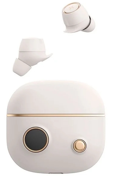 Ini adalah salah satu model TWS paling bijaksana di pasar. Headphone yang dibuat dalam gaya vintage terlihat elegan dan menekankan status tinggi pemiliknya. Layar OLED, yang terletak di badan casing, menampilkan informasi tentang status headphone, casing, dll.