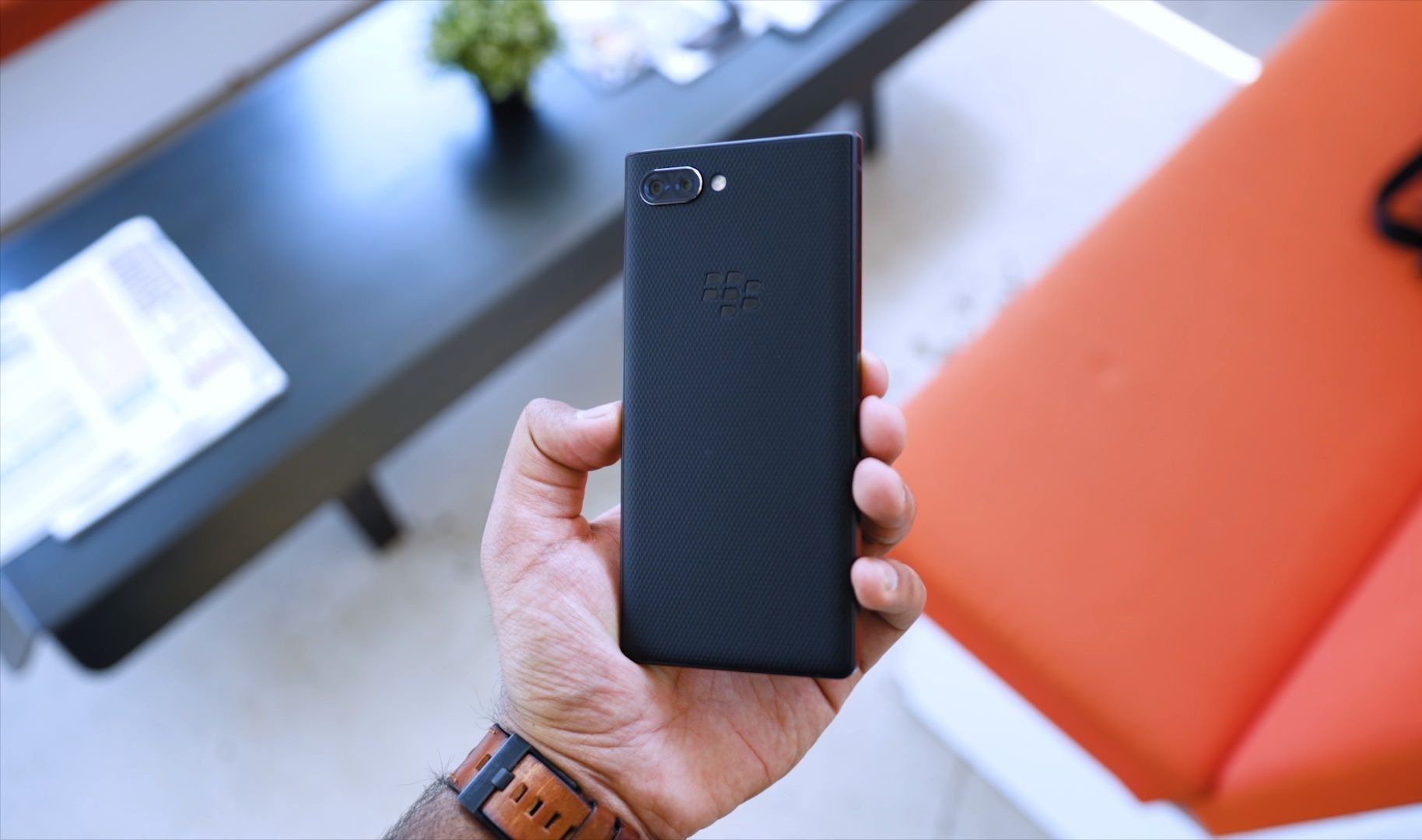 Di bagian belakang kasing terdapat 2 kamera dengan lampu kilat LED ganda. Tombol power dan volume ada di sebelah kanan. Ada juga tombol BlackBerry Convenience Key yang meluncurkan Google Assistant secara default, tetapi dapat dikonfigurasi ulang untuk meluncurkan aplikasi dengan cepat. Beberapa program disesuaikan dan dijalankan secara otomatis, tergantung pada jenis perangkat yang terhubung.