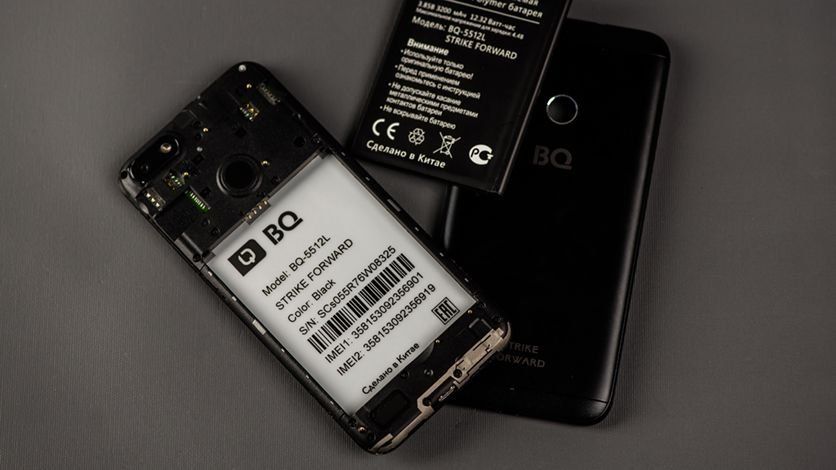 Seperti ponsel lainnya, BQ-5512L Strike Forward memiliki bodi yang dapat dilipat yang memungkinkan Anda melepas penutup dari panel belakangnya. Di bawahnya terdapat pengisian baterai, slot untuk dua kartu SIM dan kartu memori microCD.