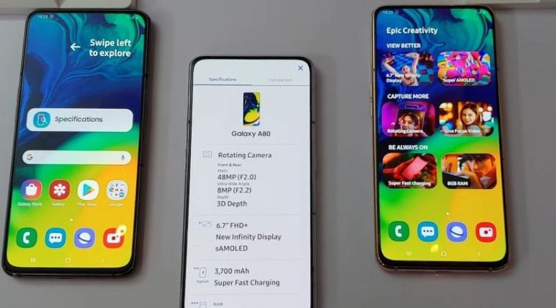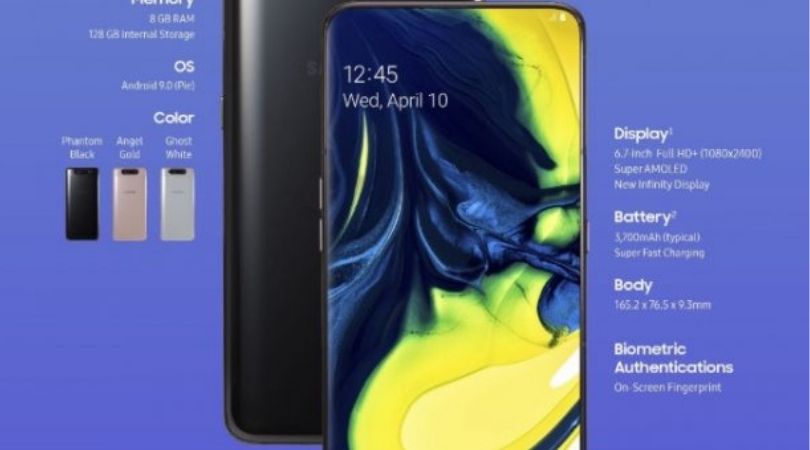 Layar Galaxy A80 dari Samsung didasarkan pada matriks Super AMOLED, dan resolusinya adalah 2400x1080 px. Rasio aspek tidak biasa, tetapi dengan rasio aspek "cine" 20:9.