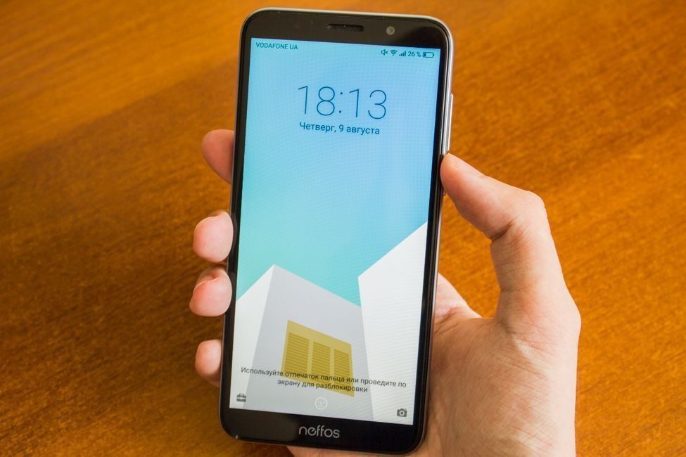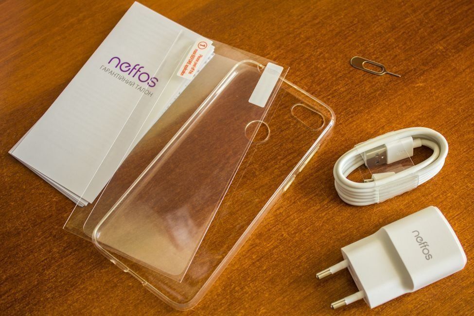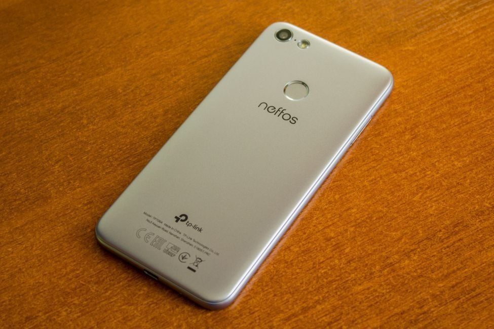 Mikrofon tambahan untuk video, lampu kilat, dan lensa kamera belakang dalam bingkai perak. Ini terlihat elegan. Pemindai sidik jari dan logo merek Neffos terletak tepat di bawah. Tulisan yang sama dari perusahaan TP-Link ditampilkan di bagian paling bawah penutup telepon.