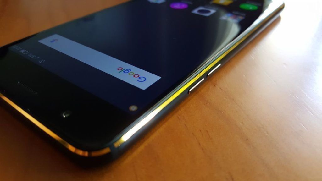Sisi-sisinya dilengkapi dengan tombol sentuh dengan indikator acara: panggilan tak terjawab, notifikasi, dan pesan ditandai dengan lampu latar merah yang berkedip-kedip. Panel sisi kanan menampung baki hibrida dan tombol daya, sedangkan sisi kiri menampung tombol volume.