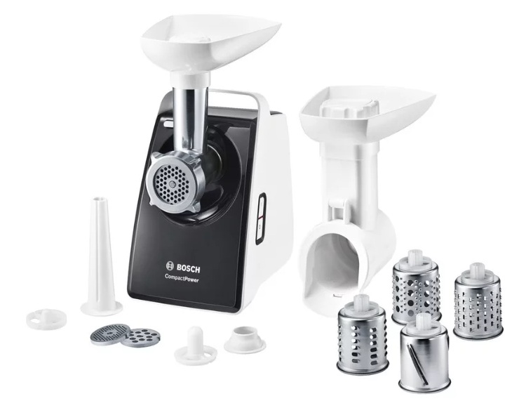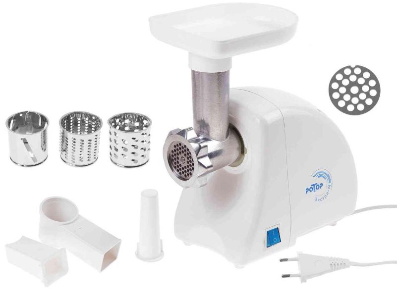 Model dengan dua kompartemen untuk menyimpan kabel listrik dan attachment, dilengkapi dengan 2 disc untuk daging cincang, attachment untuk sosis dan kebbe. Kasing dan baki terbuat dari plastik berkekuatan tinggi. Kaki diberi karet. Sangat mudah untuk membongkar / merakit peralatan, bahkan dapat dicuci di mesin pencuci piring. Untuk kenyamanan kerja, sistem kebalikan disediakan, ada pendorong.