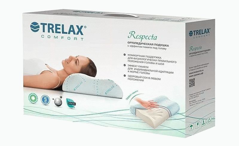 Tempat pertama ditempati oleh bantal busa memori TRELAX Respecta. Ini terbuat dari busa poliuretan viskoelastik dan dapat dengan sempurna beradaptasi dengan kepala orang yang sedang tidur.Dibutuhkan 5 detik untuk menahan kontur kepala. Bantal cukup lebar dan lembut saat disentuh, plastik. Seiring waktu, menghilangkan masalah kesehatan yang terkait dengan tidur. Harga rata-rata adalah 5500 rubel.