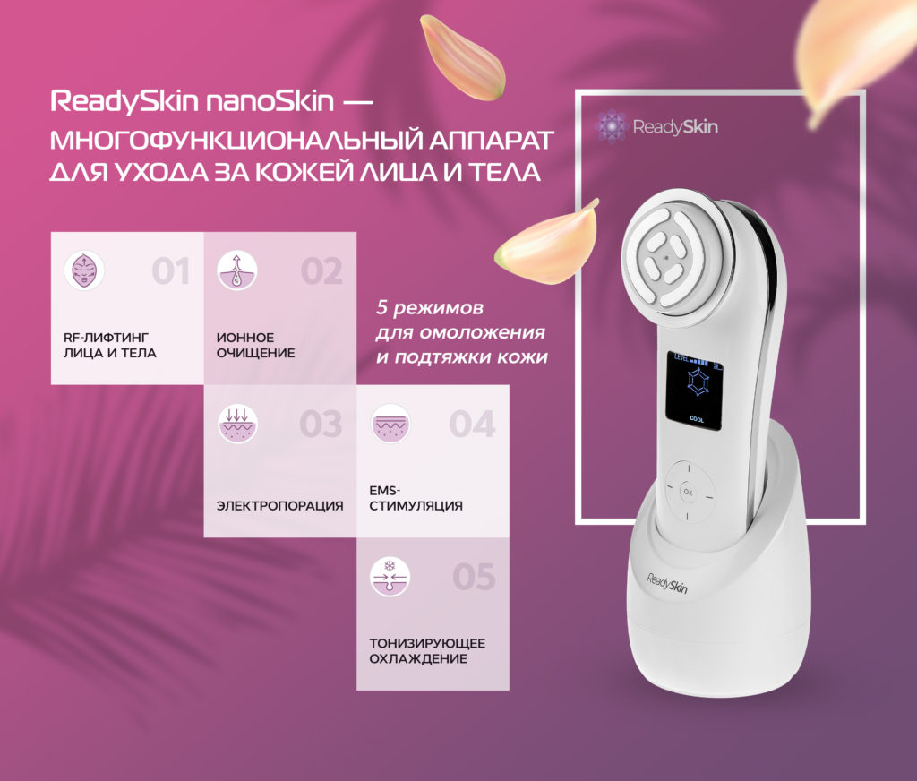 Perangkat multifungsi dari merek ReadySkin ini dirancang menggunakan teknologi terbaru di Korea Selatan, yang memberikan perawatan kulit tingkat profesional. Perangkat ini cocok untuk perawatan kulit tidak hanya untuk wajah, tetapi juga untuk tubuh, dan mencakup 5 mode operasi untuk peremajaan dan pengencangan: