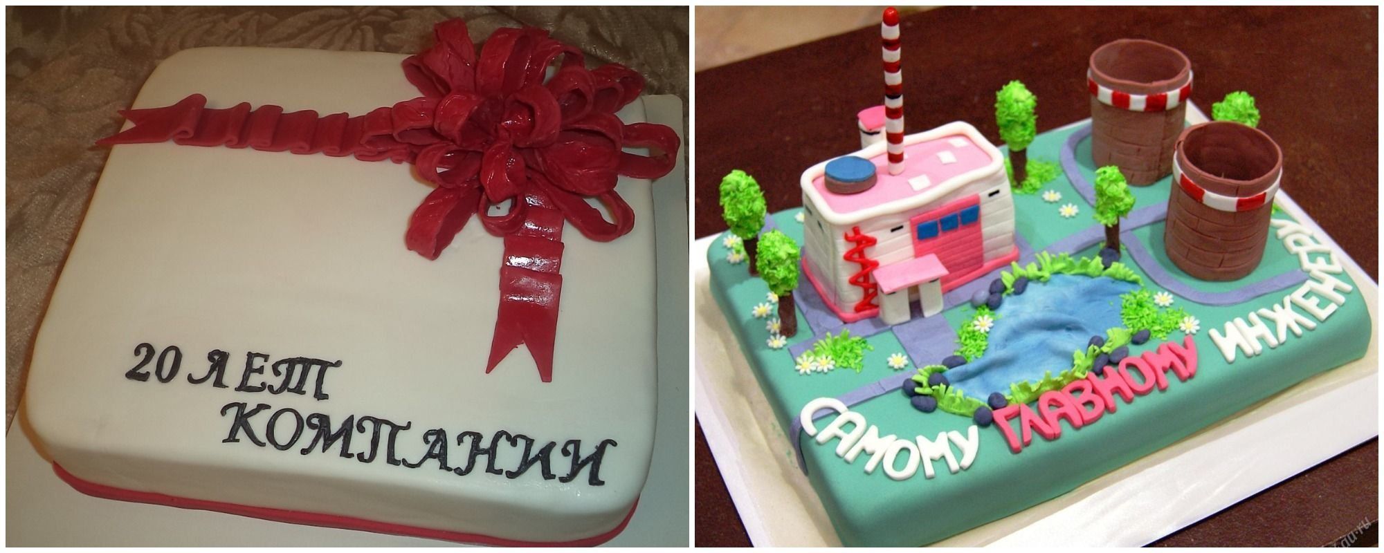 Le torte aziendali sono decorate in modo giocoso, utilizzando figure caricature fatte di mastice e iscrizioni umoristiche. Tali torte hanno il tema di una vacanza professionale (una torta per il giorno di un insegnante o di un medico), il compleanno di uno dei colleghi o un evento importante per l'intera squadra.