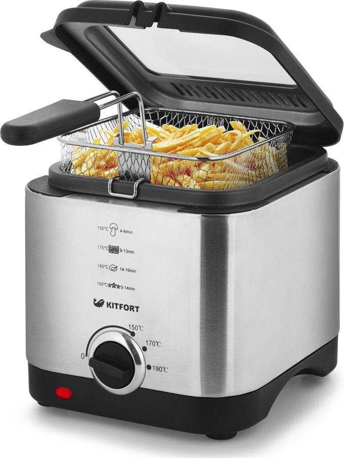 Questo dispositivo ha una grande dimensione della ciotola. Il volume del contenitore è di 1,5 litri. La potenza del dispositivo è di 900 watt. Il dispositivo ha una forma quadrata e dimensioni ridotte, quindi è conveniente riporlo negli armadietti della cucina. La friggitrice è controllata da un interruttore meccanico a levetta.Il dispositivo stesso è realizzato in metallo, che non è soggetto alla ruggine, quindi durerà a lungo. Il cestello per alimenti è removibile e dotato di una comoda maniglia realizzata in un materiale speciale che si riscalda. Pertanto, il rischio di ustioni è ridotto al minimo.