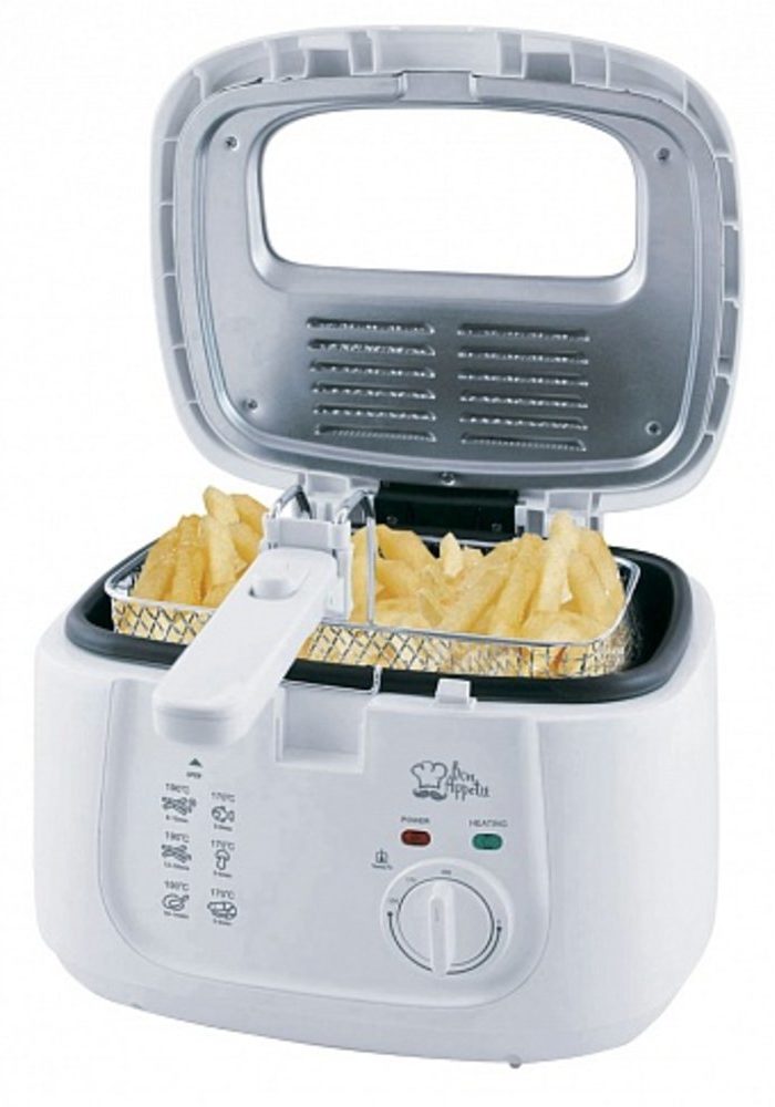 Il modello ha un rivestimento bianco e si adatta a qualsiasi design, ha ottenuto un gran numero di recensioni positive. Nonostante il basso costo, la friggitrice è realizzata in materiale resistente e durerà a lungo. La potenza del dispositivo è di 18000 W, il volume della ciotola è di 2,5 litri. Pertanto, l'elettrodomestico da cucina sarà un aiuto ideale per una famiglia numerosa. La gestione avviene tramite un apposito interruttore rotativo a levetta, l'utente potrà vedere la fine della cottura con l'ausilio di due indicatori. Lo speciale cestello è dotato di un manico removibile. Il materiale dell'impugnatura non si riscalda, quindi gli utenti sono protetti dalle ustioni. Durante l'uso della friggitrice, gli odori estranei non entrano nella stanza, poiché il dispositivo è dotato di filtri speciali.