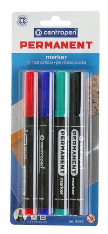 Questo set di strumenti permanenti del famoso marchio CENTROPEN ti consente di scrivere su quasi tutte le superfici: tessuto, vetro, pellicole, plastica. Può essere utilizzato per creare didascalie, titoli, tipo di pubblicità. Il colore e la saturazione delle linee non sbiadiscono con il tempo e non sbiadiscono sotto il sole. L'inchiostro per pennarelli è resistente all'abrasione, all'interazione con l'acqua e alle precipitazioni. La composizione dell'inchiostro è l'alcol, che consente di lavorare nella tecnica della smaltatura. La punta tonda permette di tracciare linee fino a 2,5 millimetri di spessore. Ci sono quattro colori nel set: rosso, blu, verde, nero. Il costo consigliato per le catene di vendita al dettaglio è di 350 rubli.