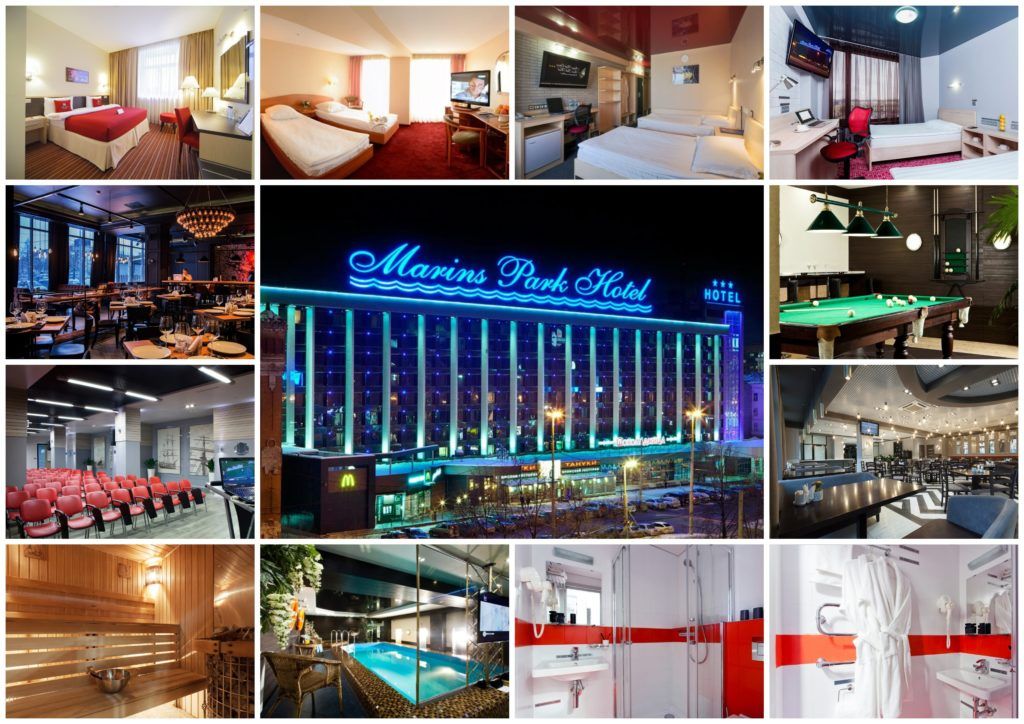 Il più antico e grande "Marins Park Hotel" è stato inaugurato nel 1969, progettato per 406 camere. Si trova in centro (2 km dal centro della città). Alla stazione ferroviaria - 300 m, all'aeroporto - 17 km. A cinque minuti a piedi dalla stazione della metropolitana "Uralskaya". Oggi ha un design moderno, stile, dotazioni, nel 2015 è stata revisionata. Qui puoi rilassarti, lavorare, sottoporti a procedure mediche, divertirti: nove piani di comfort per tutti i gusti.