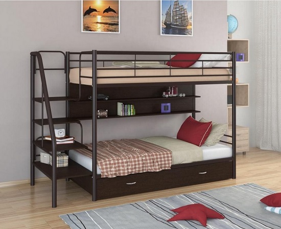 Ci sono anche letti a castello. Con un livello aggiuntivo c'è una scala. Se il letto è destinato ai bambini, vengono realizzati paraurti speciali.