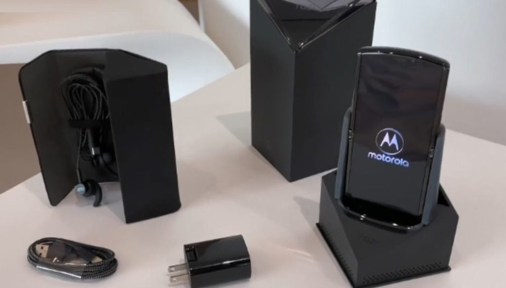 Il RAZR 2019 viene fornito in una scatola attraente in un fattore di forma triangolare su cui i designer hanno lavorato. Oltre al dispositivo, la confezione include: un adattatore per la ricarica rapida, un cavo USB e delle cuffie con connettore Type-C.