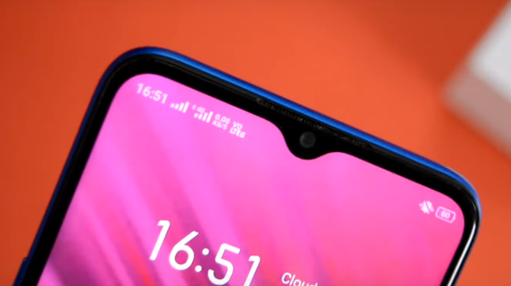La parte anteriore dello smartphone ha un grande schermo, sopra il quale è presente un ritaglio della fotocamera a forma di lacrima al centro, e un piccolo tratto del mento in basso.