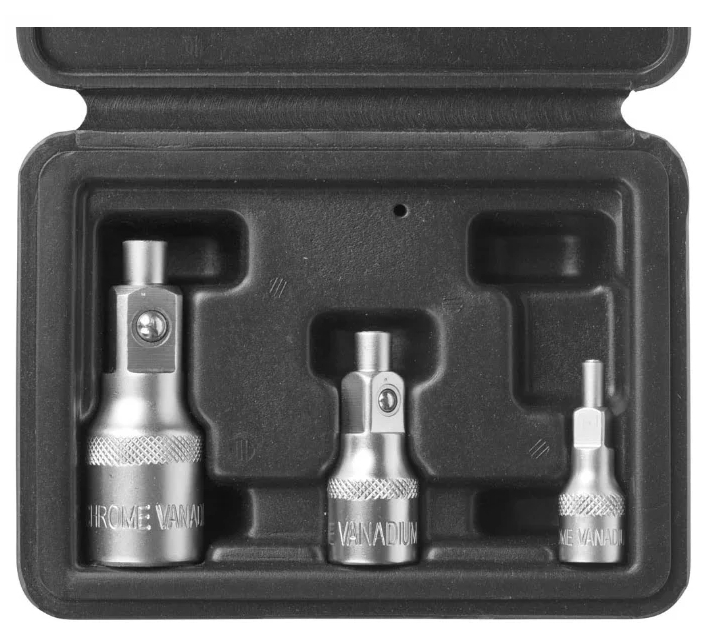 Acquistando questo modello, diventi il proprietario di un set economico di alta qualità di adattatori in acciaio al cromo-vanadio trattato termicamente. L'unità quadrata da 1/4 ", 3/8" e 1/2 "è dotata di un fermo a sfera per evitare che le teste cadano e i suoi bordi smussati assicurano che si adattino saldamente alla presa.