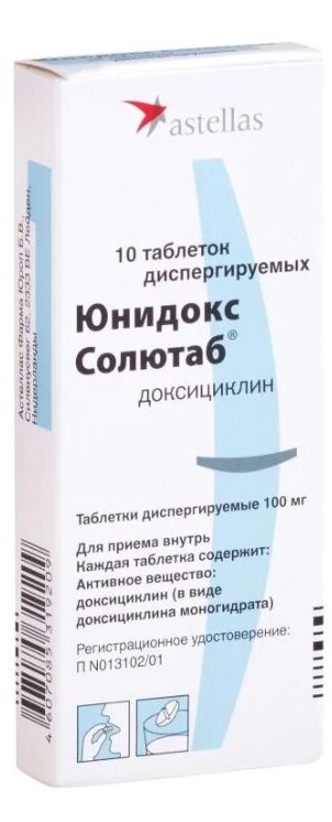Produttore: Astellas / ZiO-Health (Giappone / Russia). Forma: compresse che si dissolvono rapidamente in acqua (preparazione di una sospensione). Il principio attivo è la doxiciclina, azione batteriostatica.