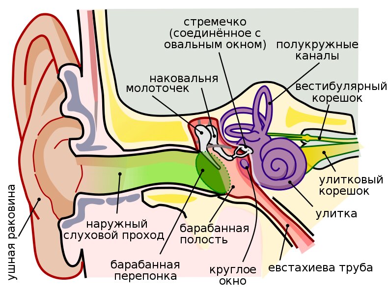 Le onde sonore raggiungono il timpano (membrana) e lo fanno vibrare. Dietro la membrana dell'osso temporale c'è una cavità (volume 1 cm3), tre ossicini uditivi: un'incudine, un martello, una staffa. La membrana è collegata tramite legamenti all'impugnatura del martello, la testa del martello è collegata all'incudine, l'incudine è collegata alla staffa, la base della staffa è la parte interna.